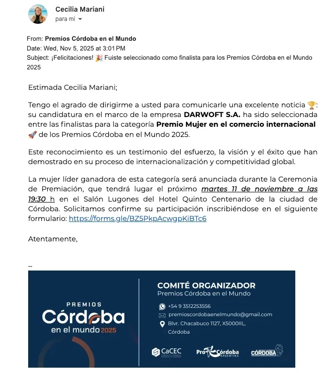 Cecilia Mariani was selected as a finalist in a government-supported international trade award recognizing women leaders in global commerce and export excellence. The nomination highlights her executive leadership in internationalization, competitiveness, and global market expansion.